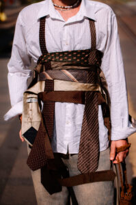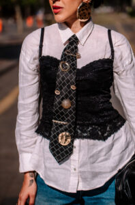 Por último y NO MENOS importante, encontré muchos looks con piezas completas hechas a partir de corbatas: desde corsets, hasta faldas. El upcycling sigue siendo una técnica maravillosa para reutilizar prendas en desuso, modificarlas y crear algo totalmente nuevo.