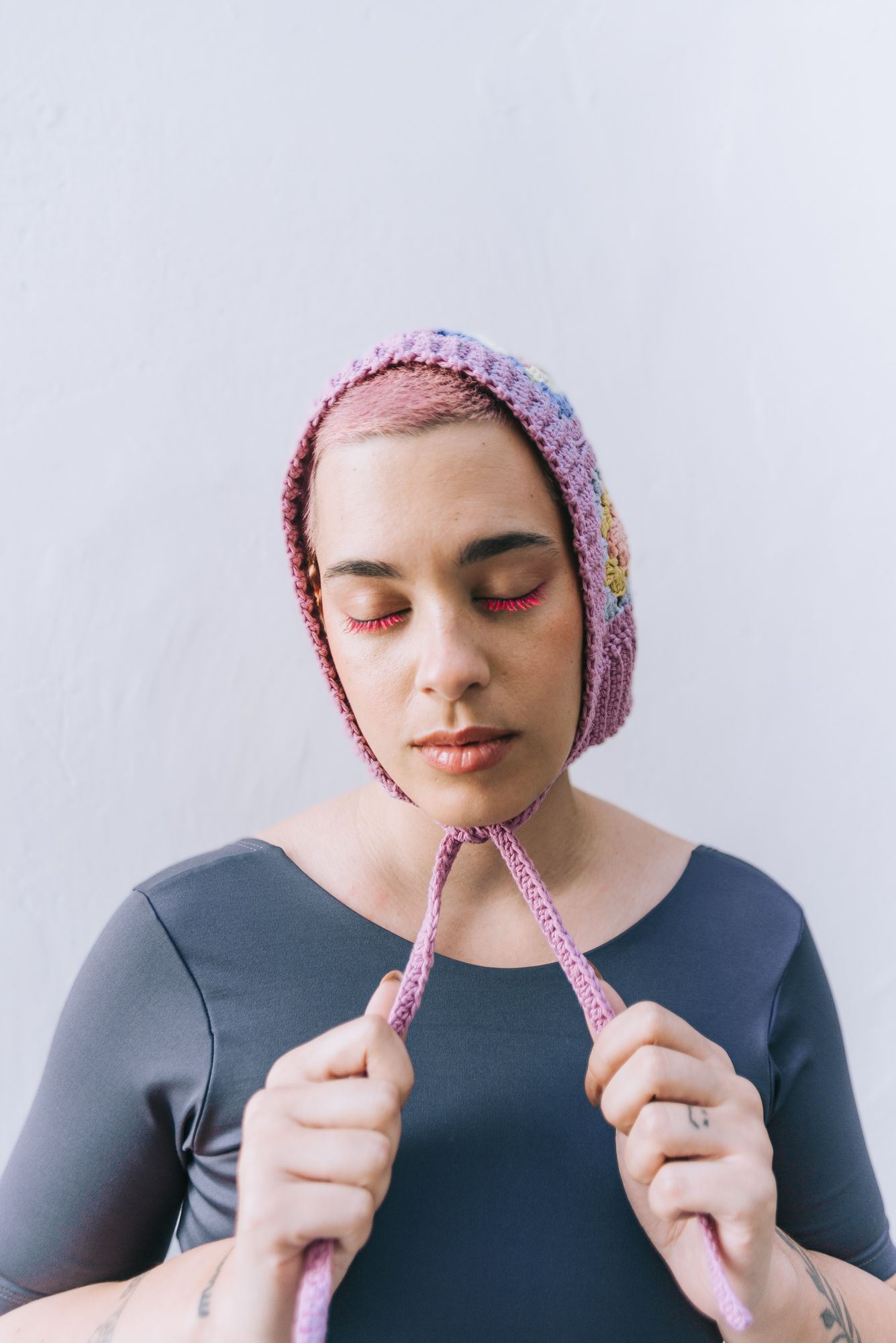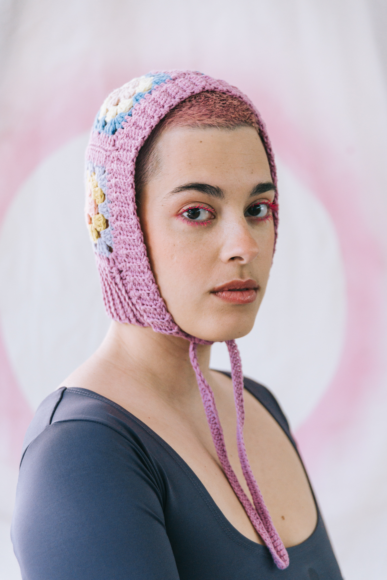 Gorro tipo caperucita tejido a mano con la técnica de crochet. Tiene 2 tiras para ajustarlo y atarlo al cuello. Está hecho a partir de patchs también tejidos y combinando otros colores. Con terminación en punto elástico para que se amolde a la cabeza.