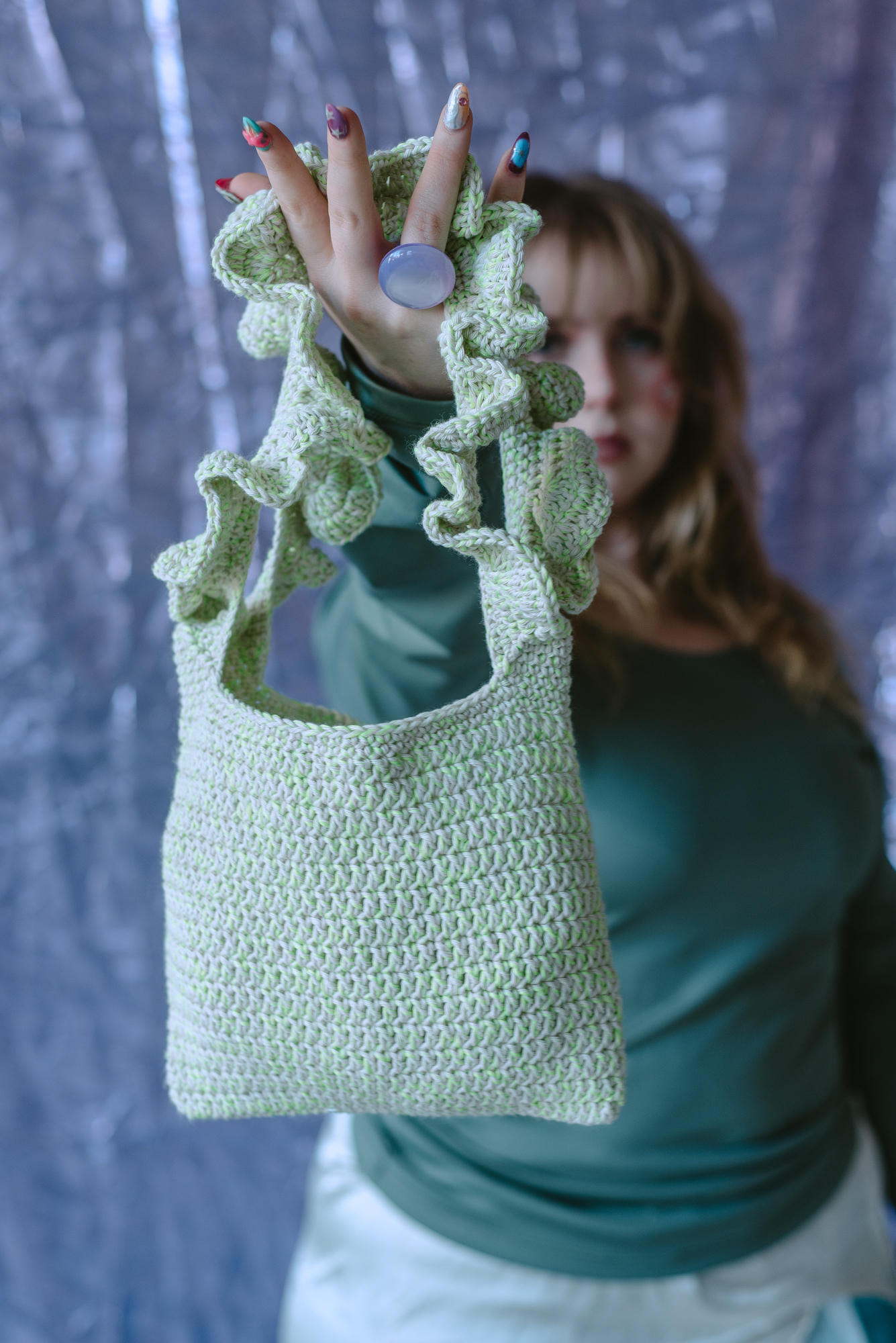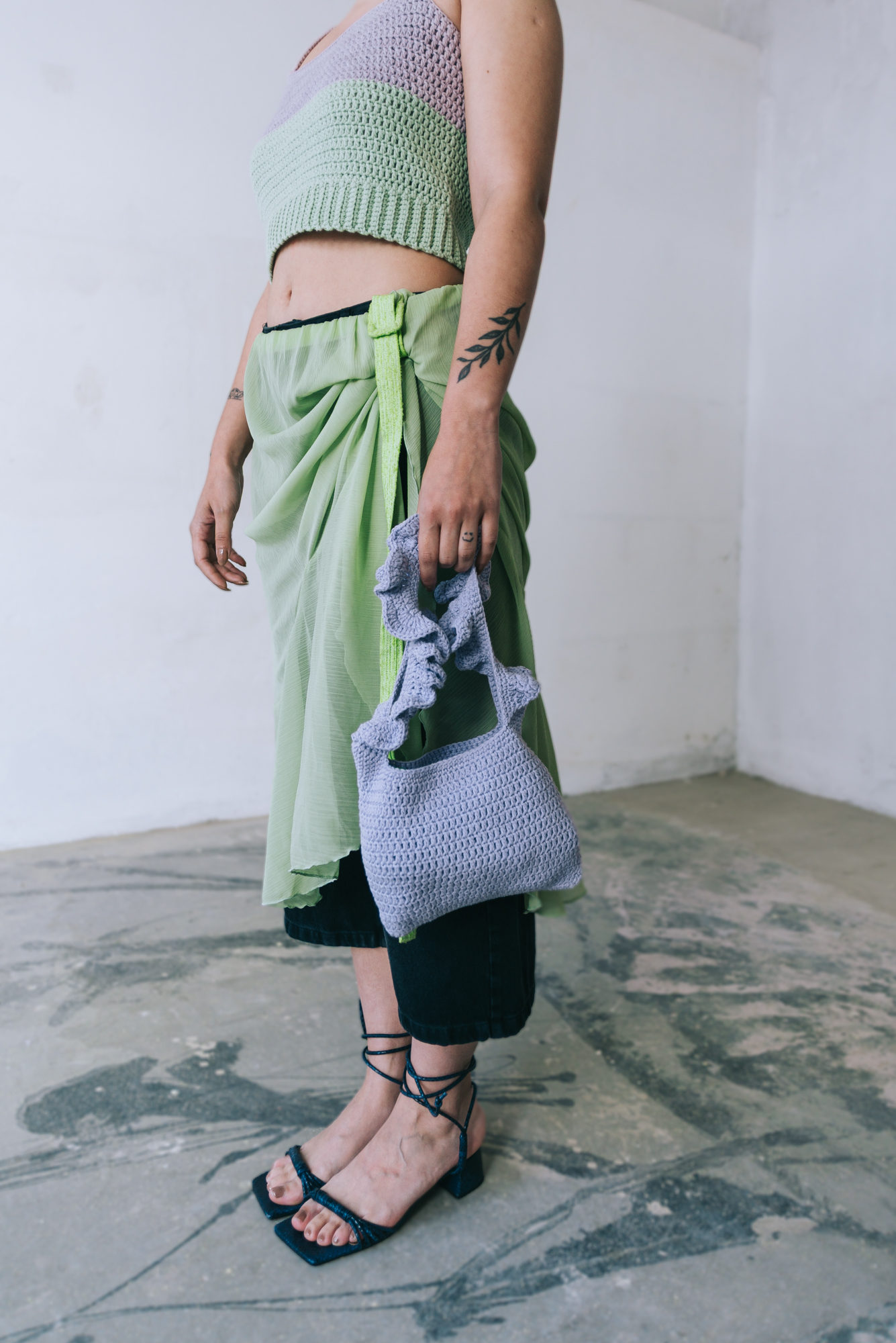 Cartera pequeña con manijas de volados. Está tejida a mano con la técnica de crochet.