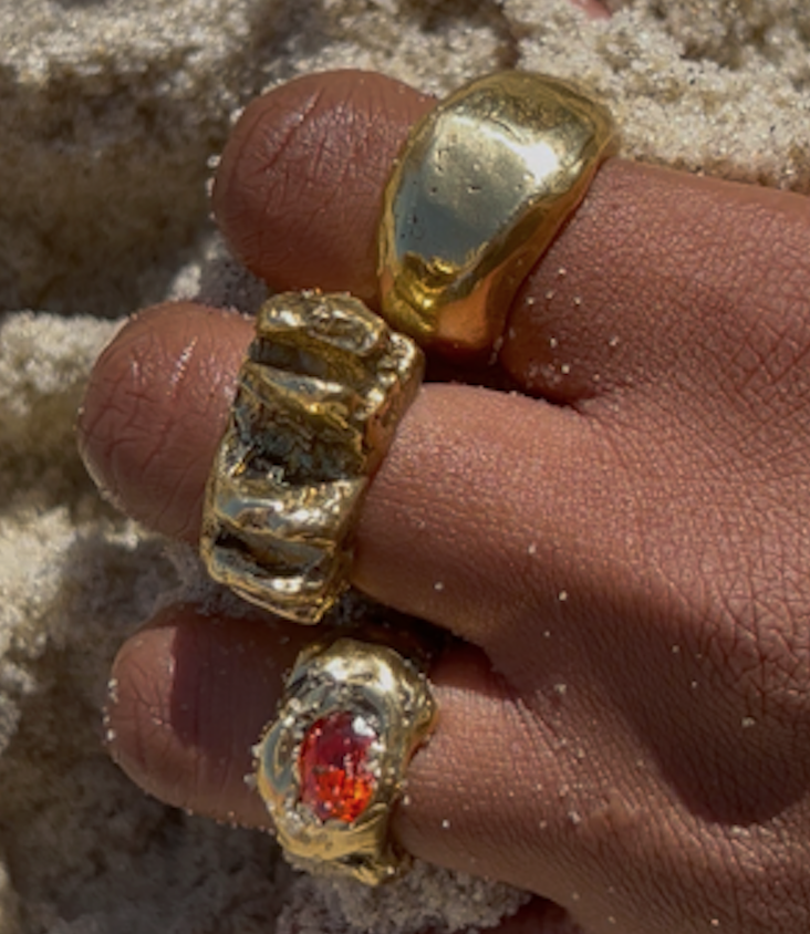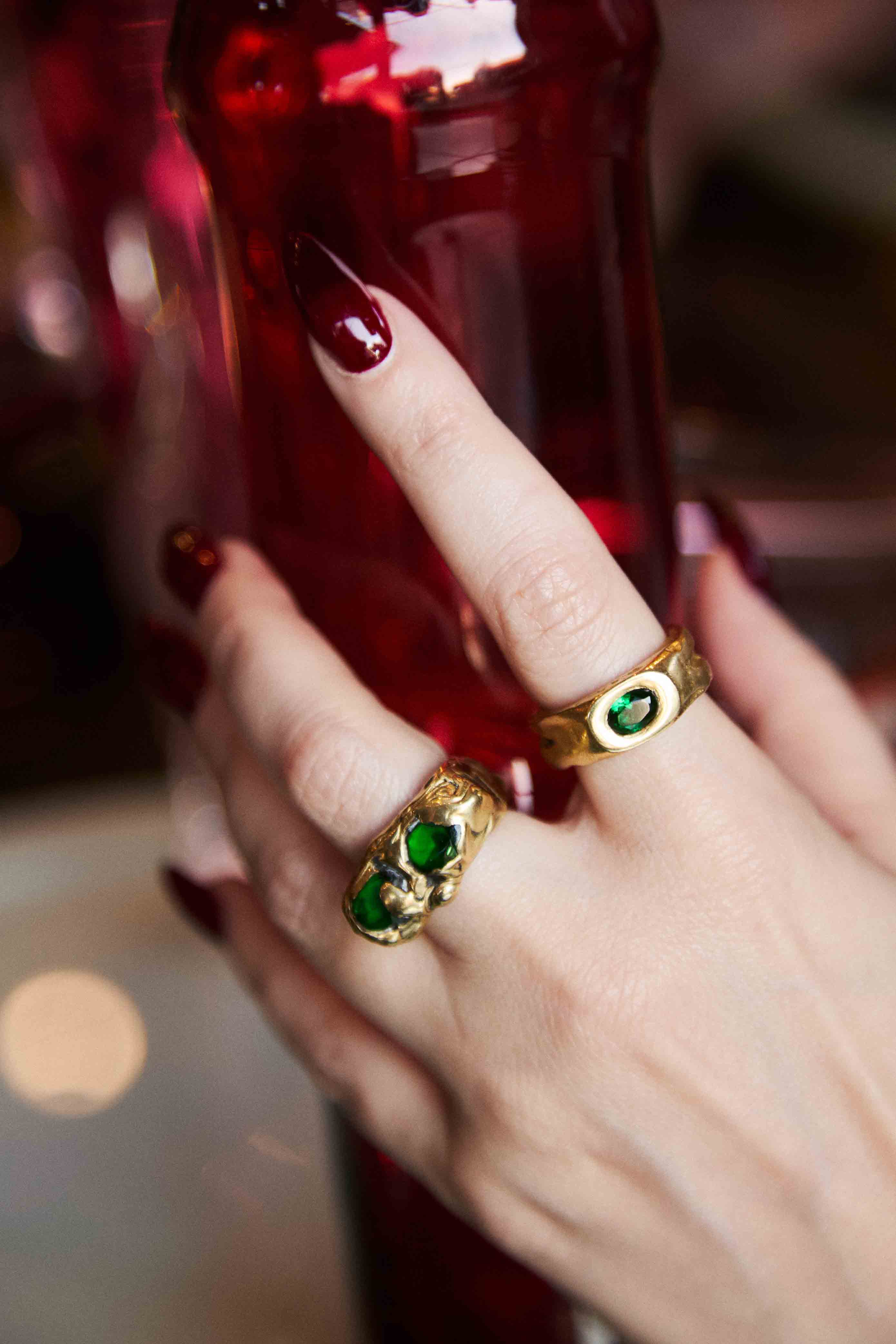 Anillo de bronce con textura irregular y detalle de vidrio en el centro. El vidrio viene en variedad de colores: azul, rojo, verde.
