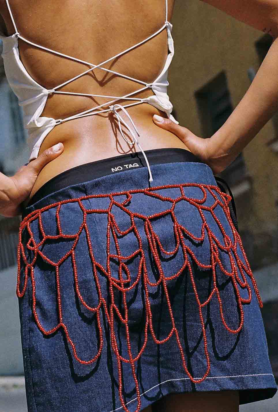 Sobre falda hecha integramente a mano. Con canutillos que forman una trama. Es ideal para usar por encima de prendas variadas, como faldas, pantalones, o para el verano con bikini o traje de baño.