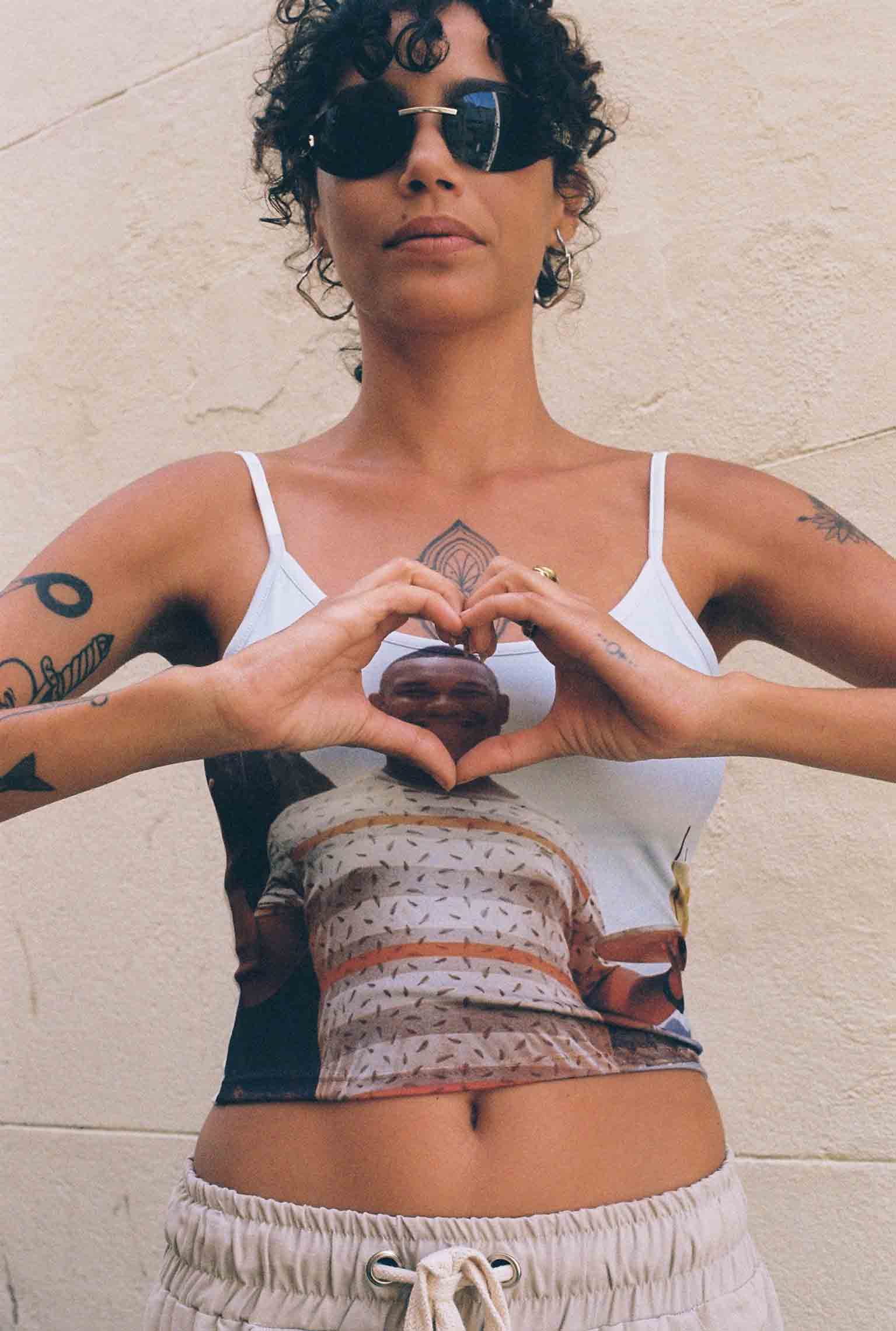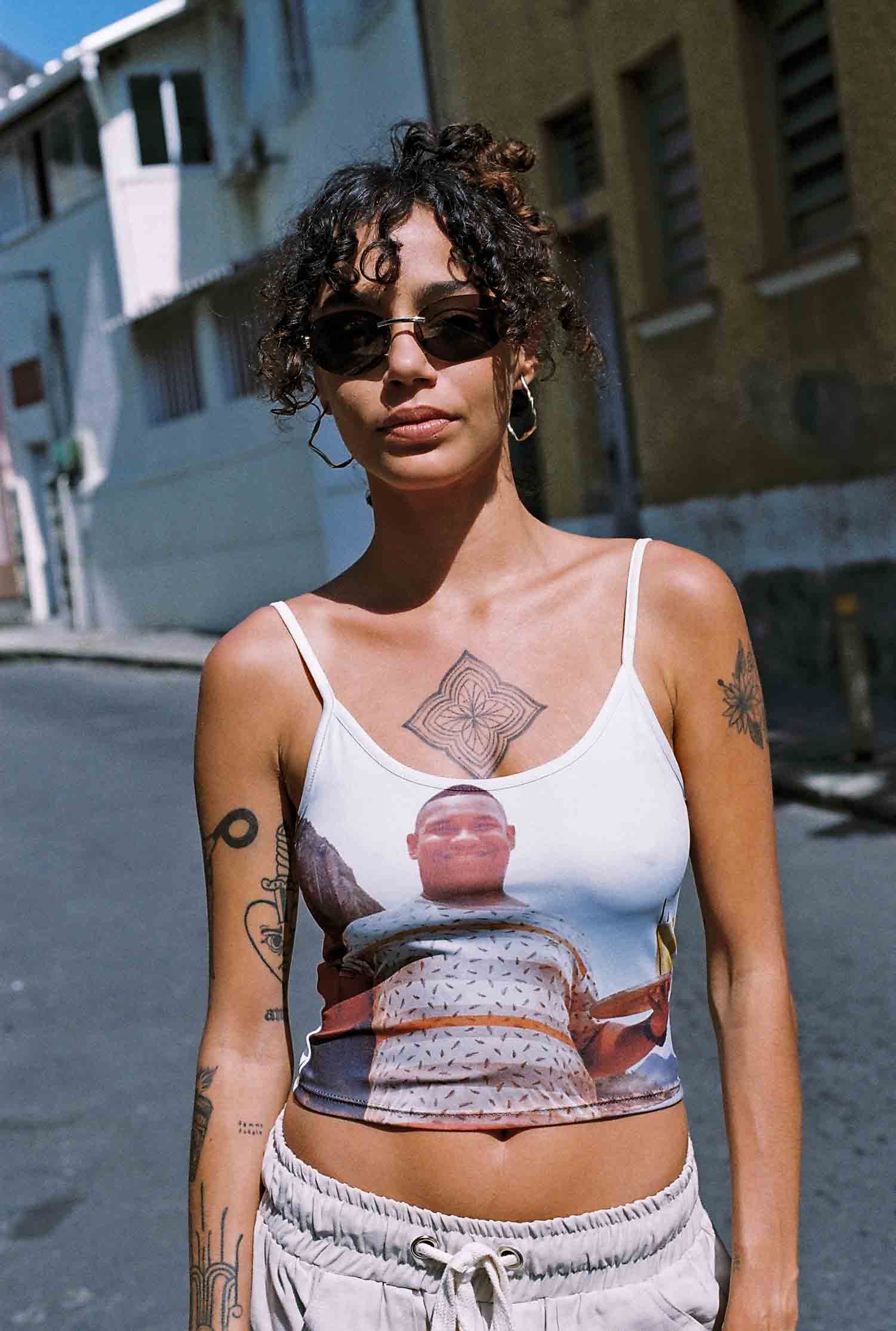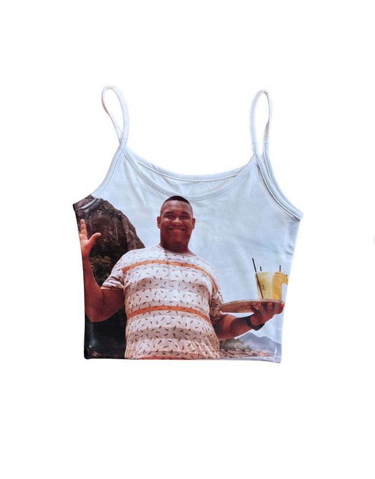 Top corto con breteles. Estampada hecha a partir de una foto. Una escena típica de RIO DE JANEIRO, en la playa con sus vendedores ambulantes. Es sublimada a mano. Diseñada en exclusiva por Uwu para ROOMIE.