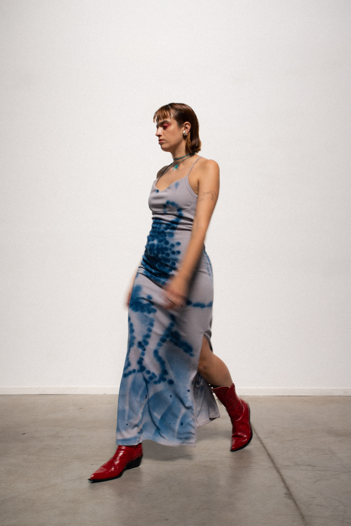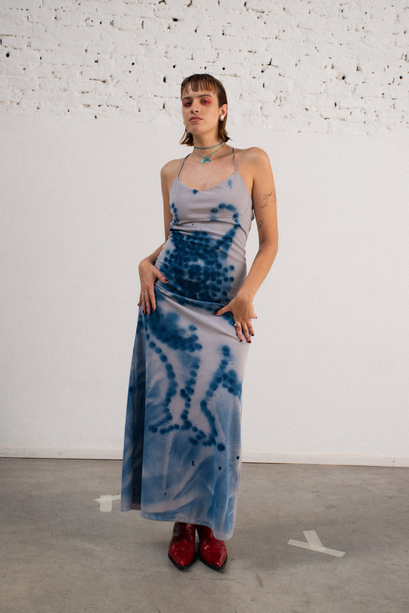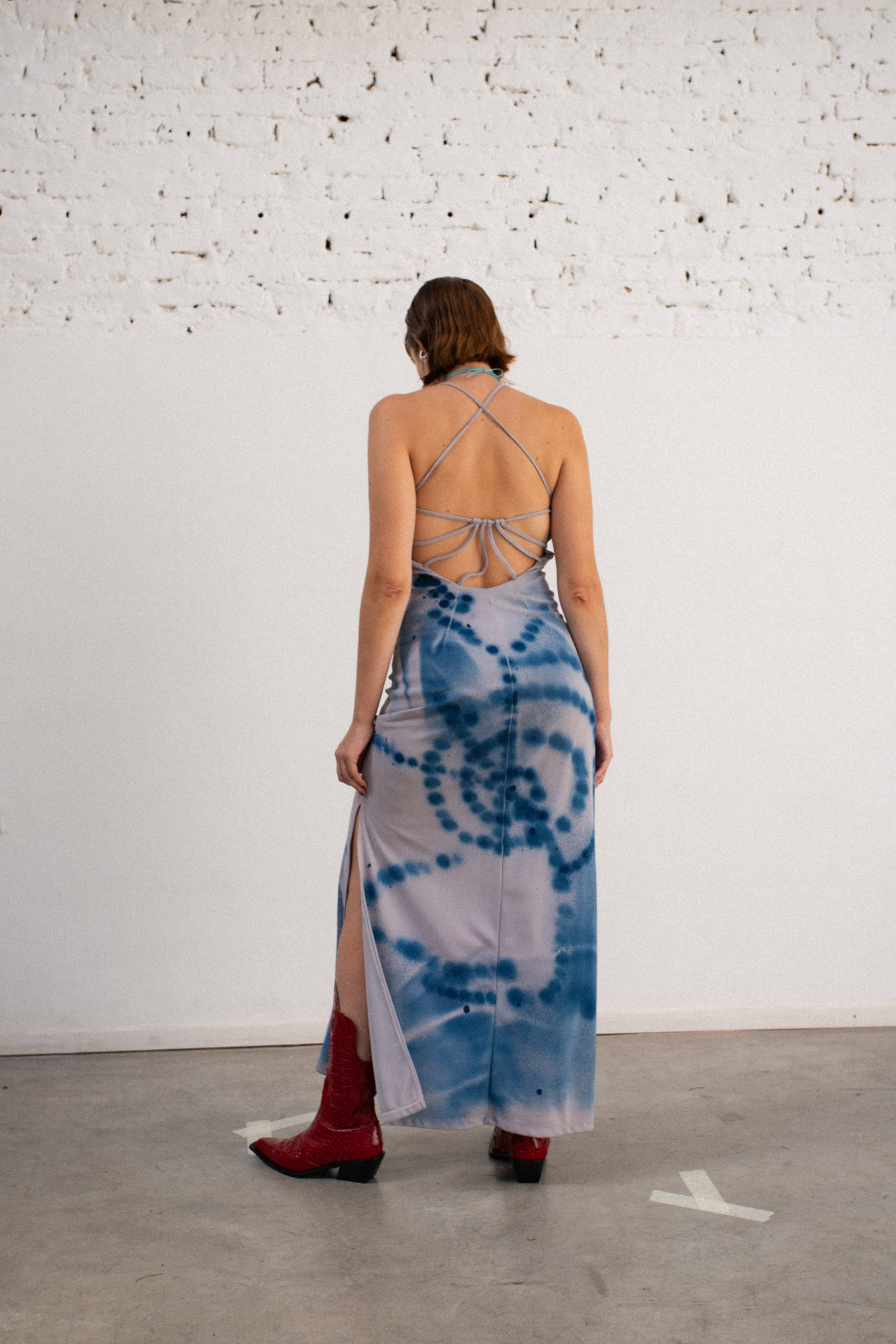 Vestido largo al piso con espalda descubierta. El vestido es vintage en impecable estado, fue intervenido a mano, pintado con aerosol color azul. El corte ajusta levemente en la cintura, es amplio abajo y con un tajo en uno de los laterales. La espalda es abierta y tiene un diseño de tiras que se cruzan. Es e vestido ideal para usar tanto de día con botas o zapas, como de noche con accesorios y sandalias elegantes.