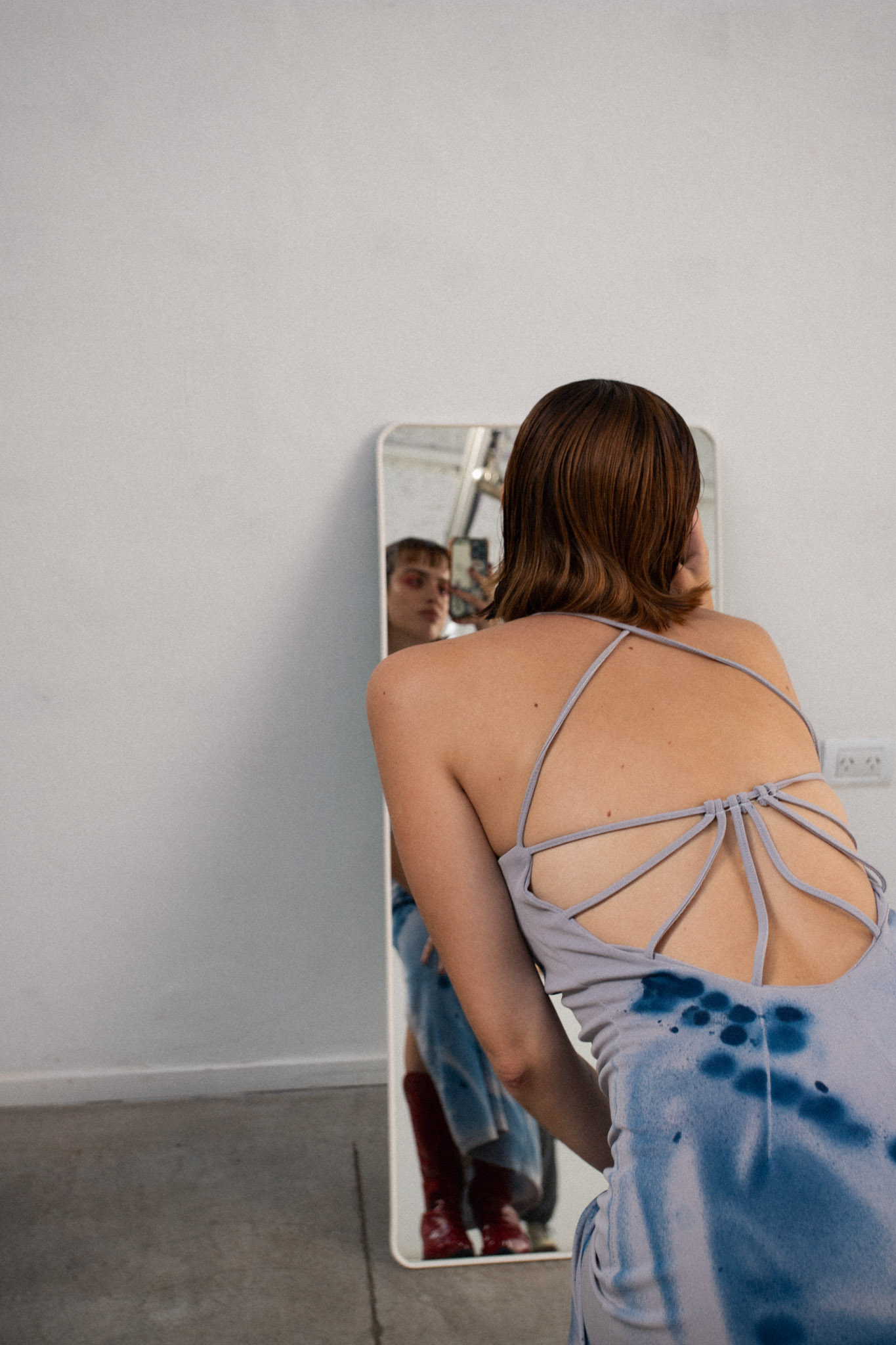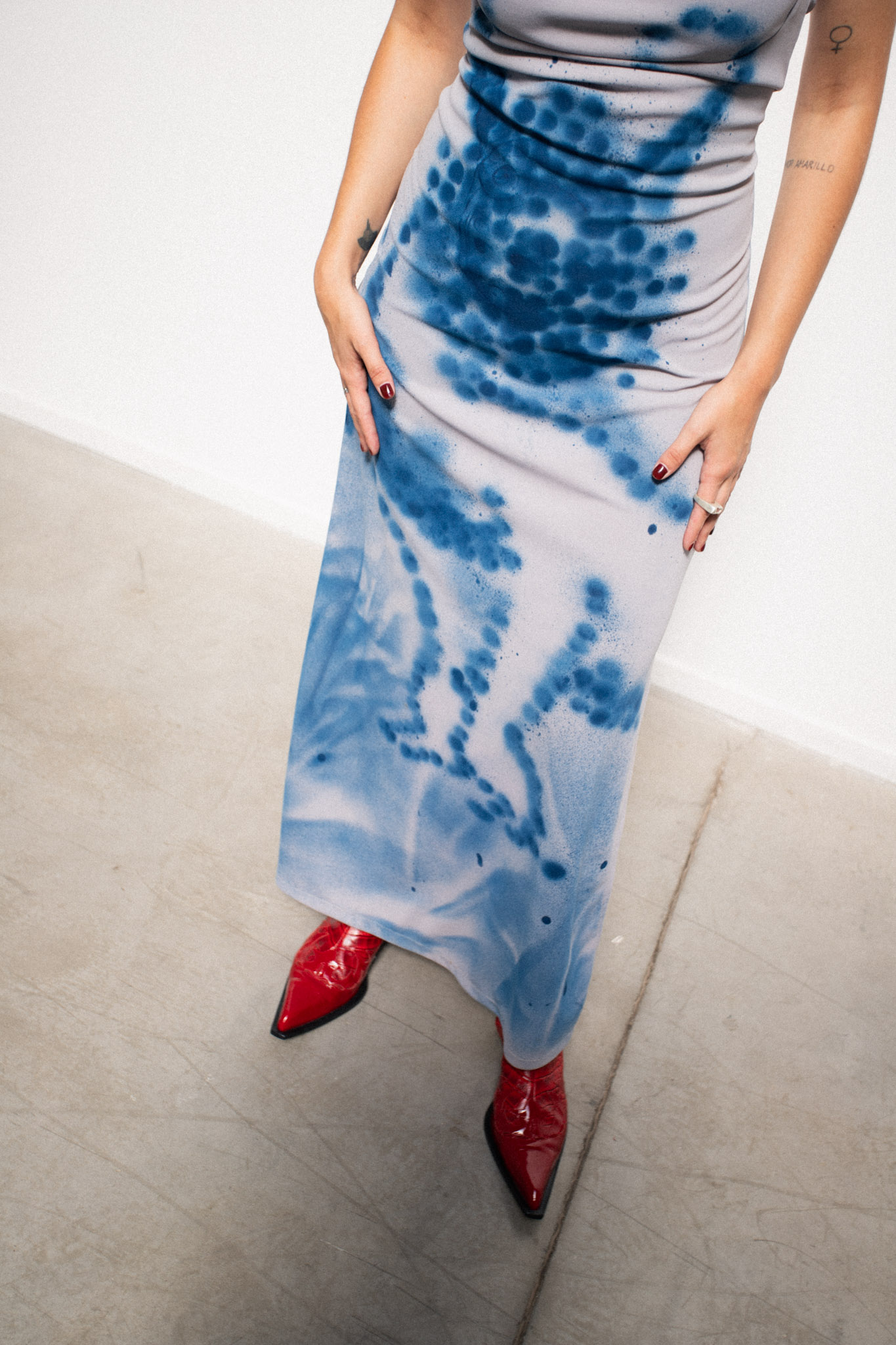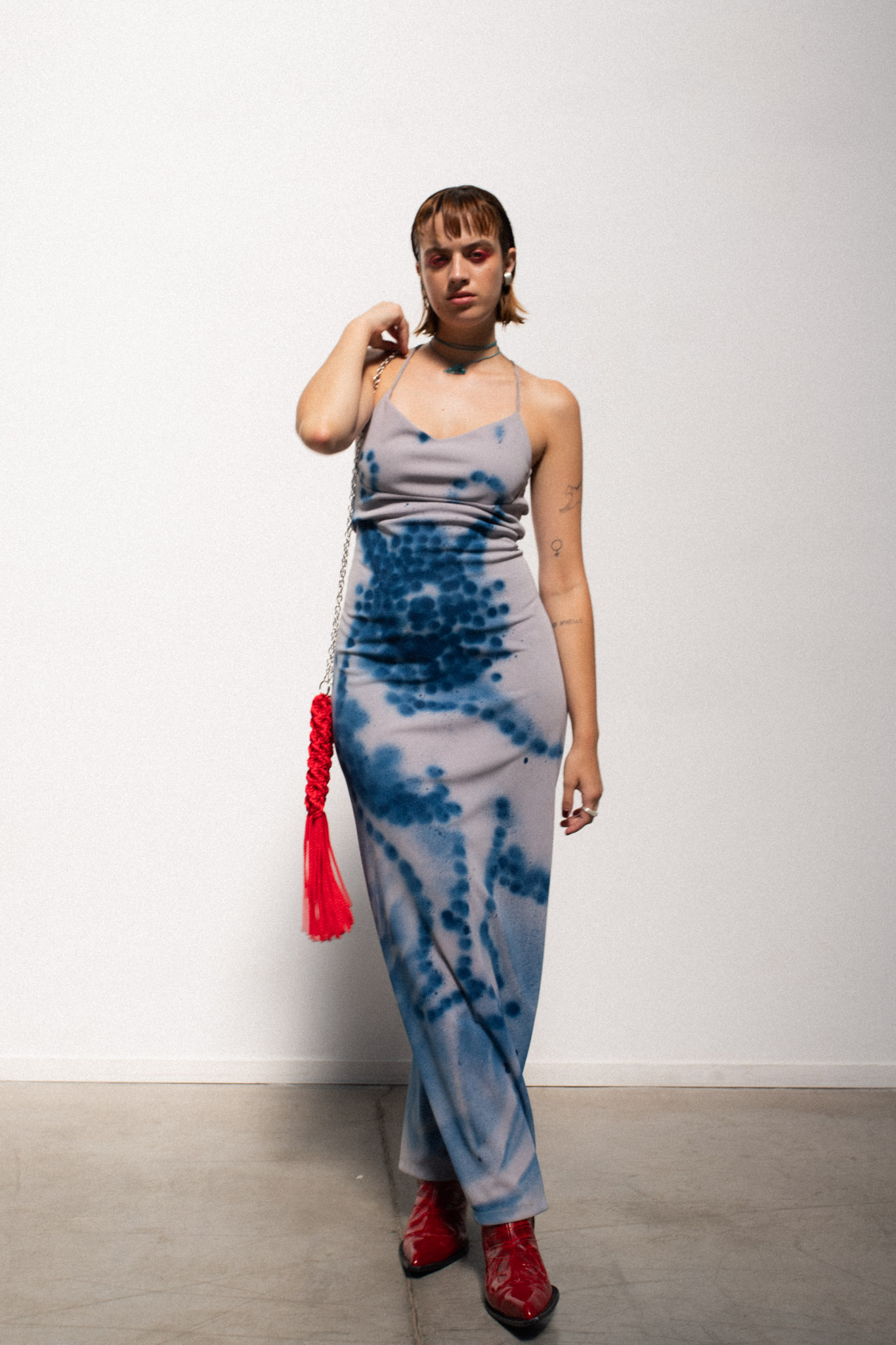 Vestido largo al piso con espalda descubierta. El vestido es vintage en impecable estado, fue intervenido a mano, pintado con aerosol color azul. El corte ajusta levemente en la cintura, es amplio abajo y con un tajo en uno de los laterales. La espalda es abierta y tiene un diseño de tiras que se cruzan. Es e vestido ideal para usar tanto de día con botas o zapas, como de noche con accesorios y sandalias elegantes.